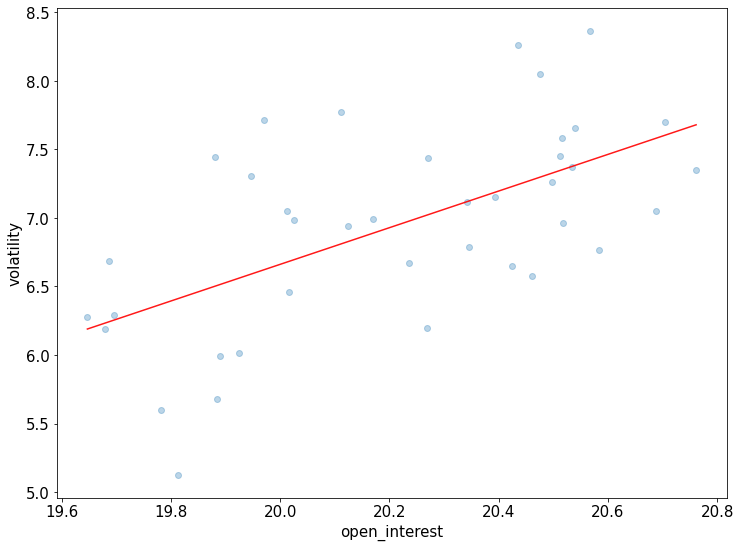 Açık pozisyonun (bağımsız değişken) ve volatilite (yanıt değişkeni) arasında pozitif bir korelasyon olduğunu tespit ettik. F-istatistiğinin (doğrusal model için) ve eğimin p-değerleri 0.001'den küçüktür. Modelin R-kare değeri 0.36 olarak tahmin edilmiştir ki bu, finansal ham veriler göz önüne alındığında makul derecede yüksektir.