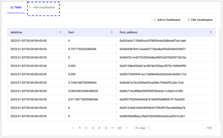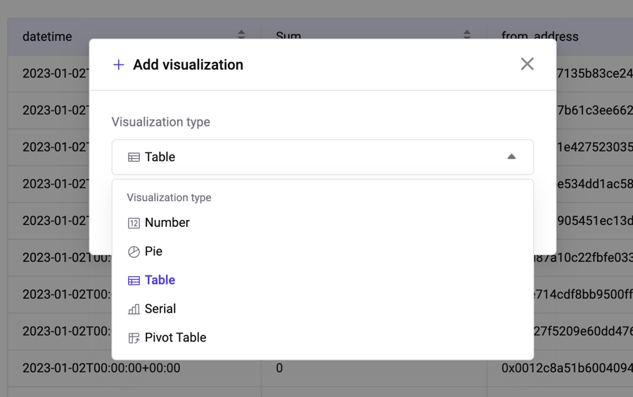 You can add a new chart visualization by clicking the "Add Visualization" button next to the Result table tab. A modal window will appear where you can choose from one of the options: table, pie, serial, number, or pivot table. The selected visualization will then be added.